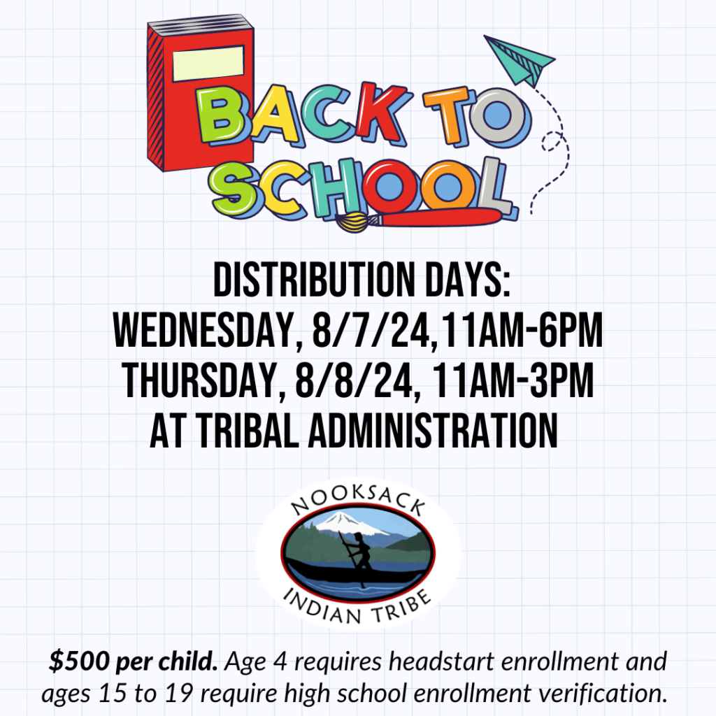 The Nooksack Tribal Council has approved Back to School Distribution in the amount of $500 per enrolled Nooksack child. Age 4 requires headstart enrollment verification. Ages 15 to 19 requires high school enrollment verification.
